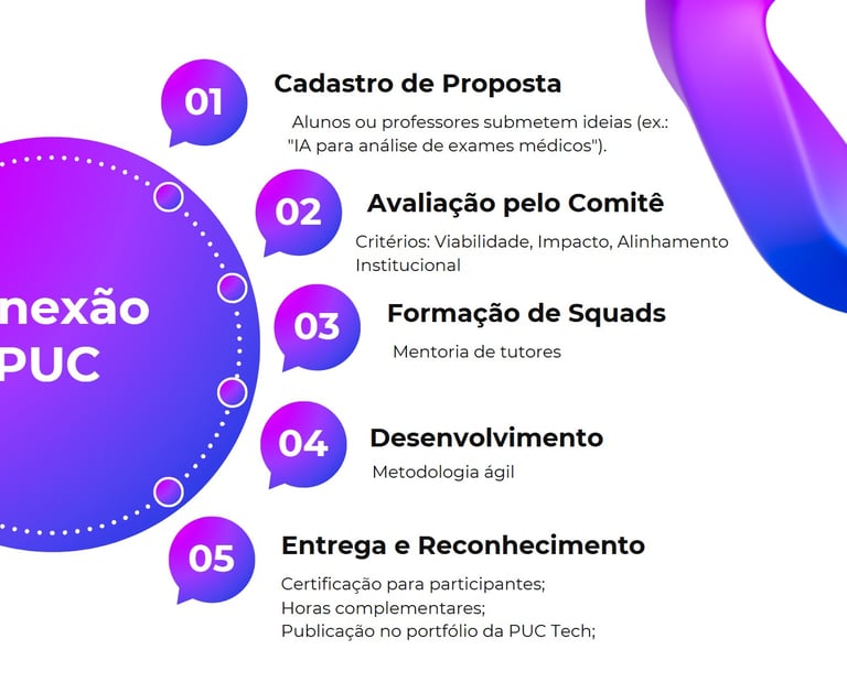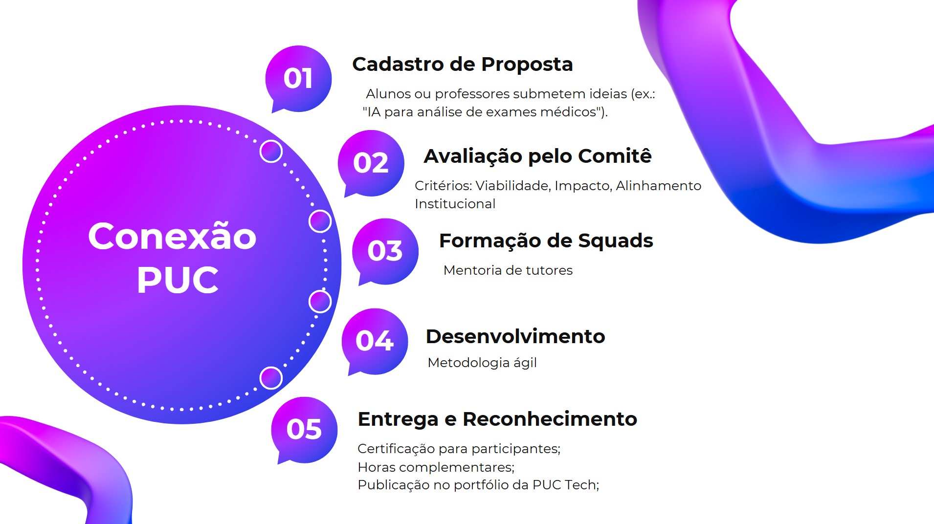Qualquer aluno ou professor da PUC-SP pode submeter uma ideia de projeto (ex: “IA para analisar laudos médicos”).